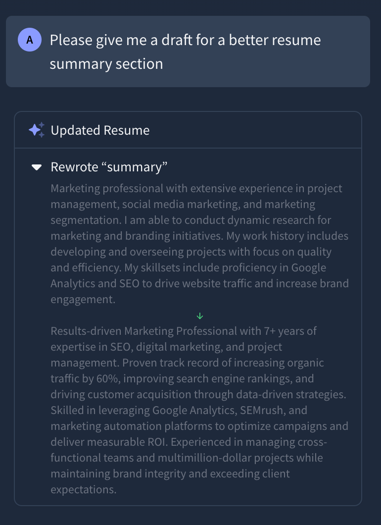 I then asked Rezi AI Agent to make my resume summary section better. Currently, it’s: