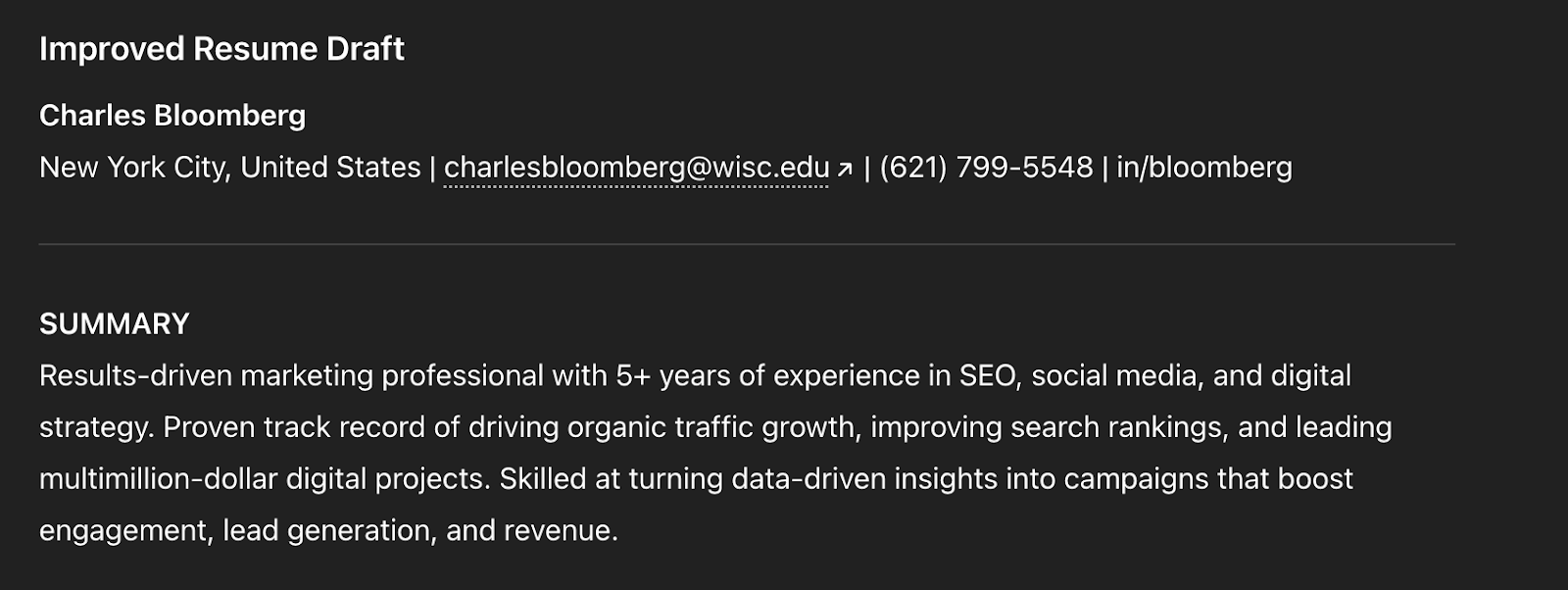 It immediately gave me an “improved resume draft.” Here’s ChatGPT’s draft for the new summary section: