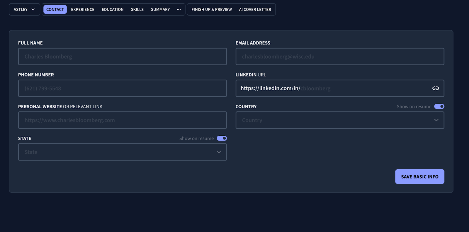You can start by importing an existing resume. Or, begin by selecting your target role and providing background details, such as your career stage and target job description. From there, you’re taken through a step-by-step approach to filling out each section of your resume while automatically formatting everything into a professional template, starting with contact details.