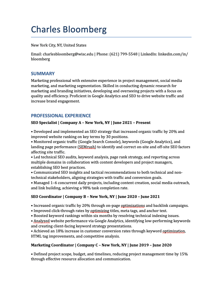 “Results-driven Marketing Professional with 7+ years of expertise in SEO, digital marketing, and project management. Proven track record of increasing organic traffic by 60%, improving search engine rankings, and driving customer acquisition through data-driven strategies. Skilled in leveraging Google Analytics, SEMrush, and marketing automation platforms to optimize campaigns and deliver measurable ROI. Experienced in managing cross-functional teams and multimillion-dollar projects while maintaining brand integrity and exceeding client expectations.”