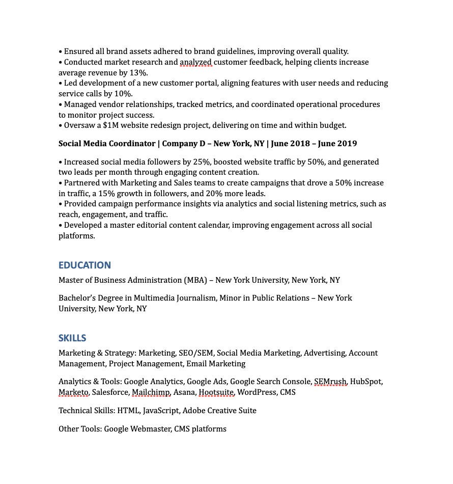 But in my experience, its results aren’t as consistently ATS-optimized as Rezi’s—which you can see in the example below (with another one coming shortly).