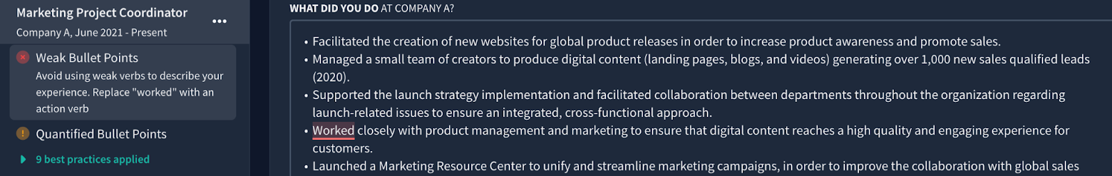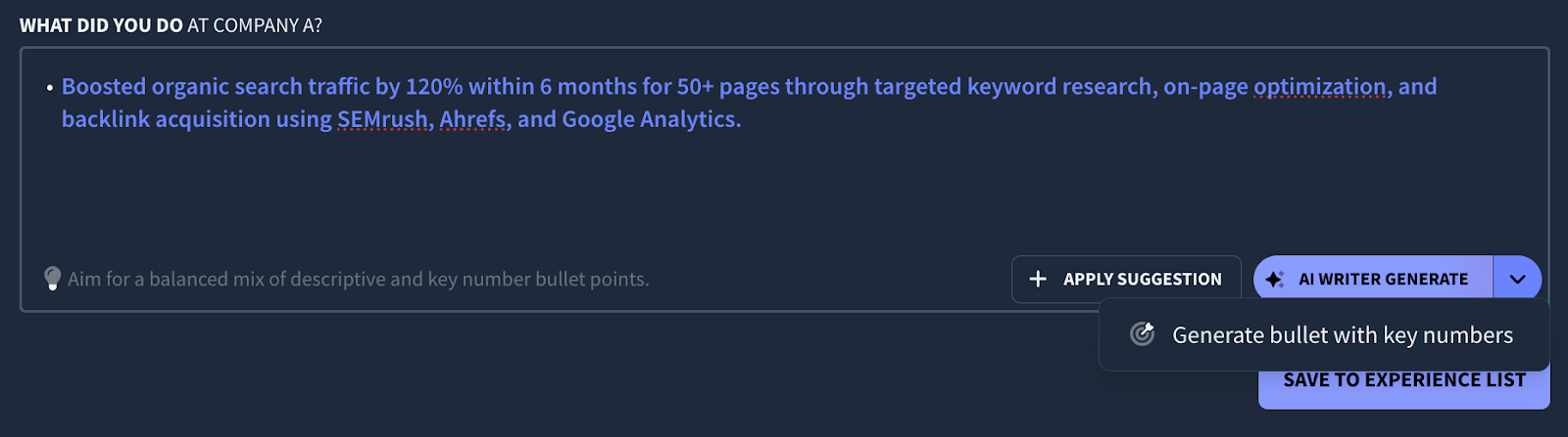 It’s also capable of generating bullet points emphasizing numbers and measurable results. Simply click “Generate bullet with key numbers.”
