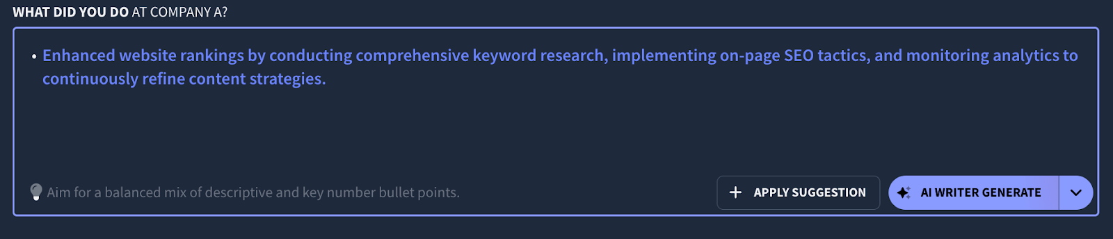 Rezi AI Bullet Points can generate resume sentences tailored to your role, experience level, and target job description. By taking these details into account, it can suggest bullet points that highlight your skills, responsibilities, and achievements.