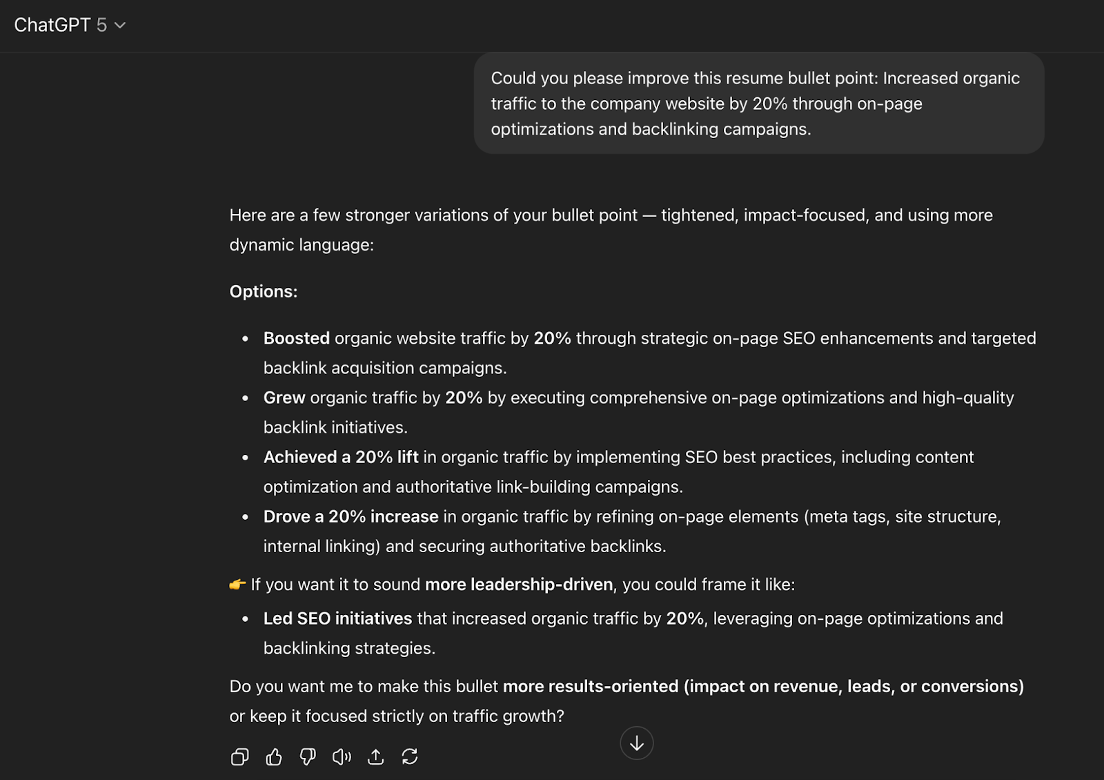 ChatGPT is capable of writing new resume bullet points and refining existing ones too, as shown below.