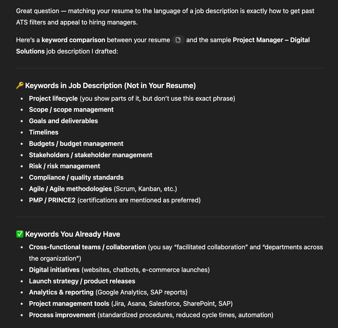ChatGPT also works well for identifying missing ATS resume keywords and suggesting where to place them. Simply paste in your resume content and the job description, then ask. Although it may not present the results in the same visual format as Rezi, ChatGPT is still more than capable of getting the job done.