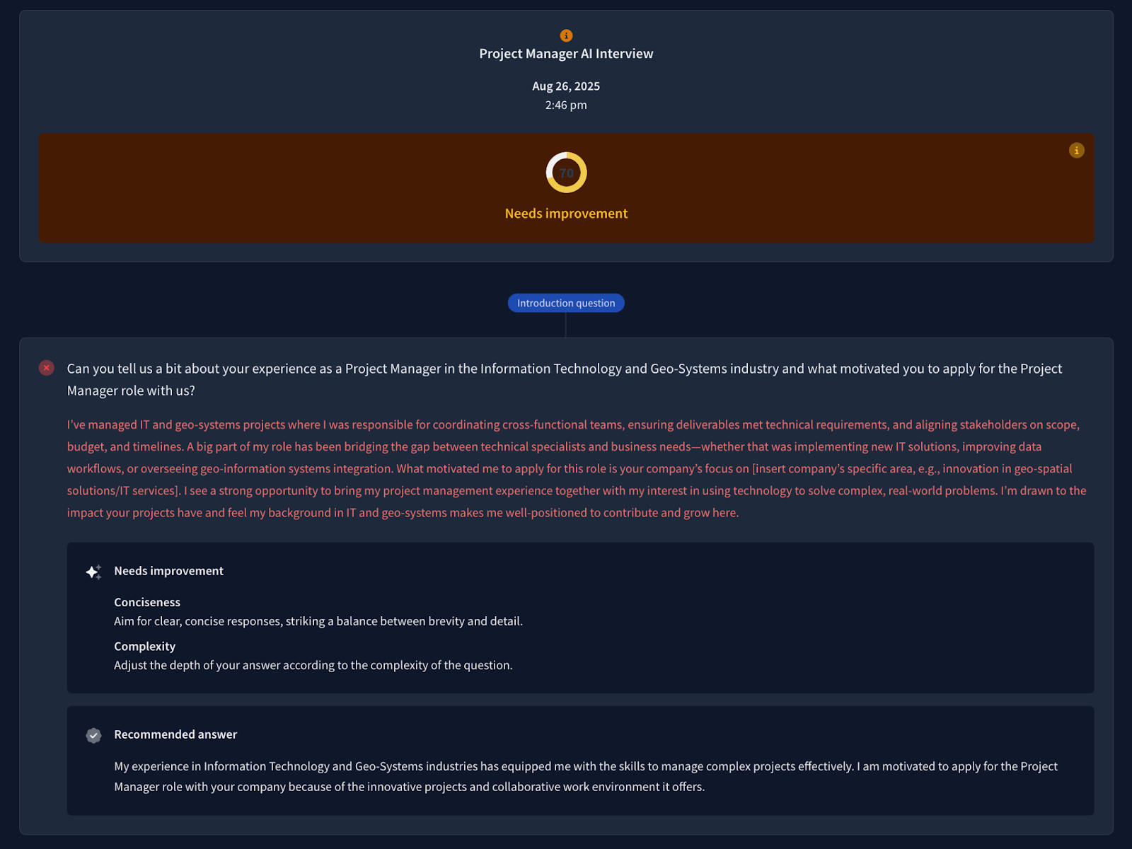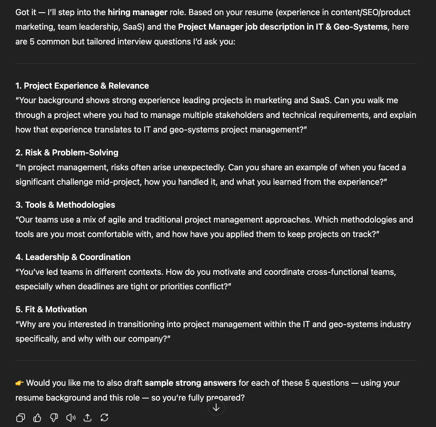 Then, respond to each question and ask ChatGPT to provide feedback on clarity, relevance, and how well your answers match the role’s requirements.