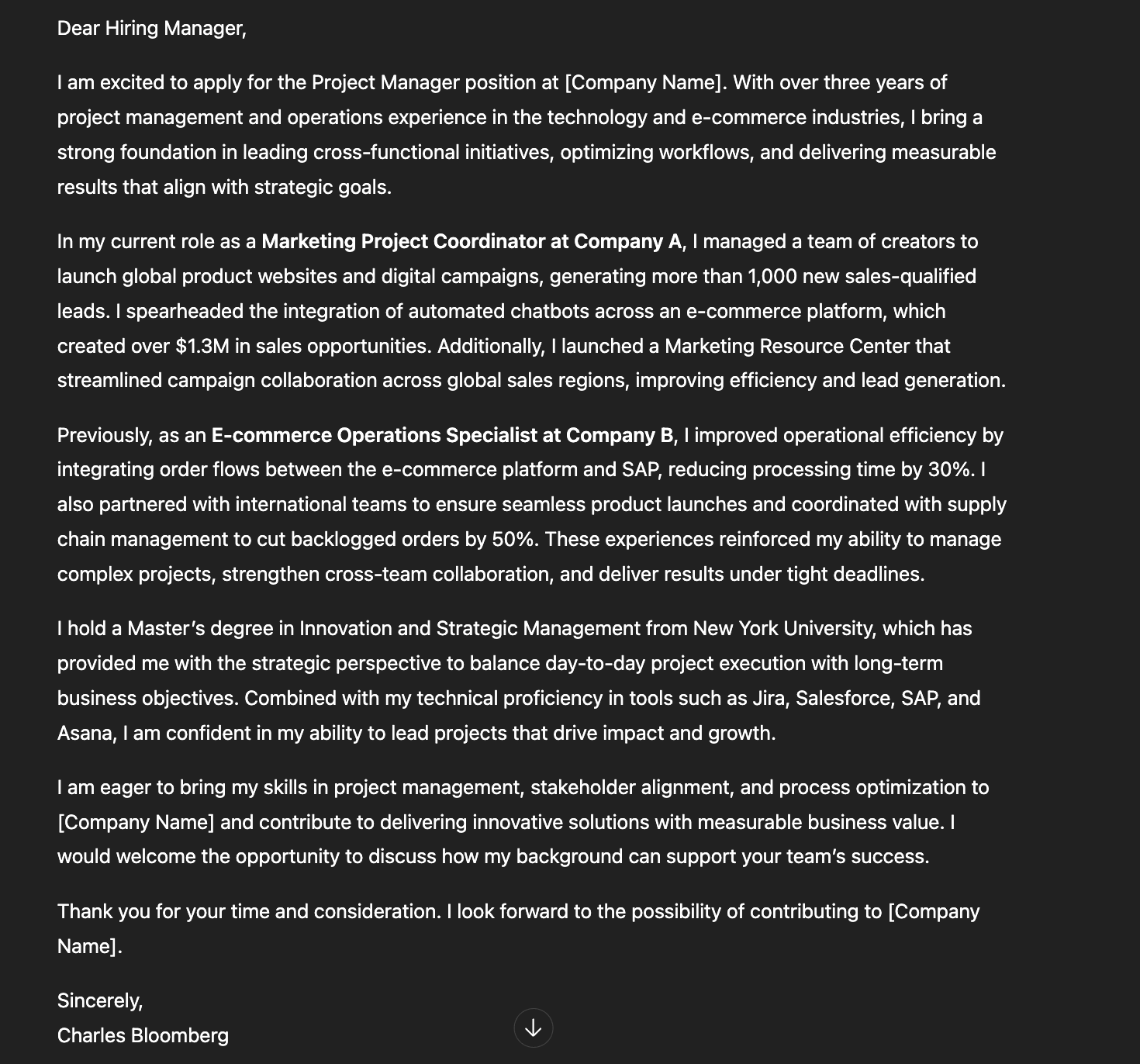 ChatGPT can also write strong cover letters when you provide enough context about your experience and the job description. It’s flexible and capable of producing content that matches your background.