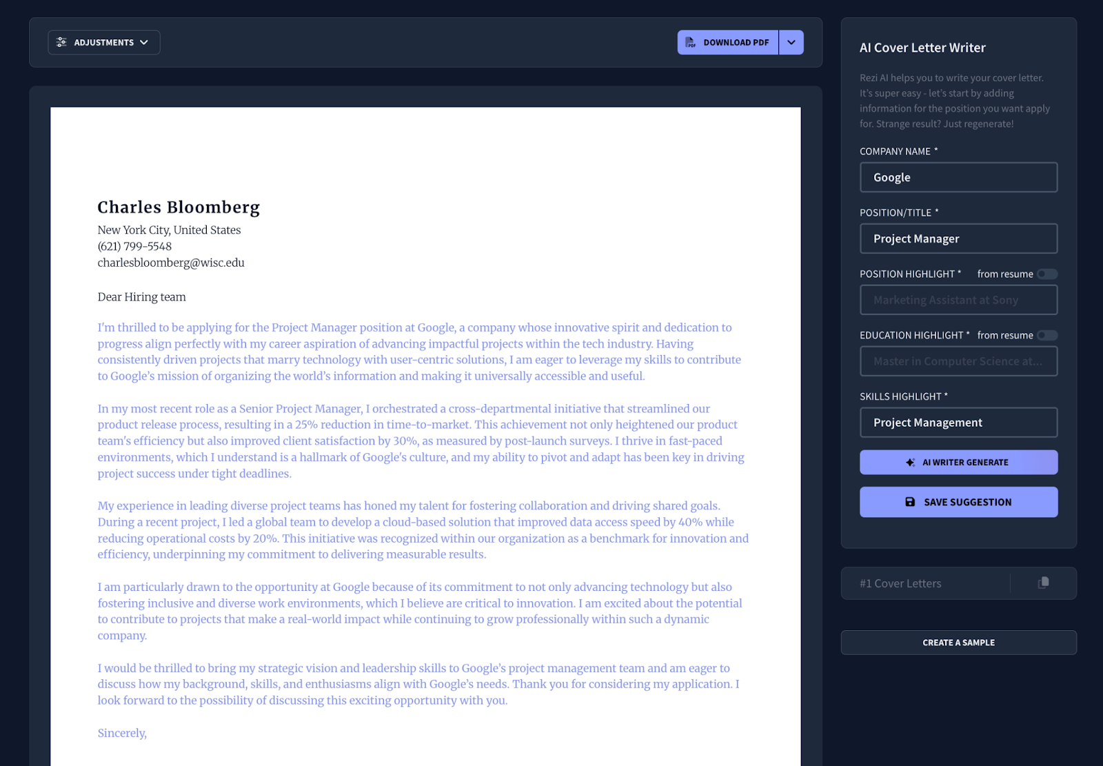 You can use Rezi’s AI cover letter builder to generate a personalized cover letter.