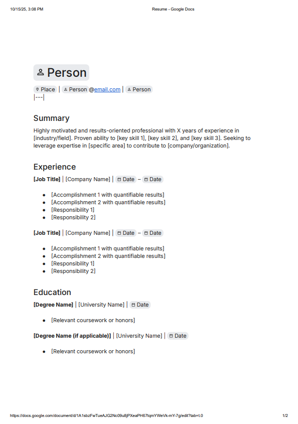 Gemini can spin up a simple resume outline in seconds from a blank Google doc, and honestly, it’s not bad, just very basic. It tends to stretch to two pages even before you start adding content, so you’ll likely need to trim and reformat to get it recruiter-ready.