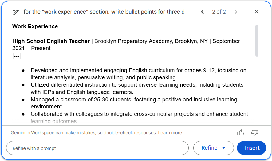 You can also tweak your own bullets by highlighting a section, clicking “refine,” and asking Gemini to add metrics or reword for impact. It does a surprisingly good job.