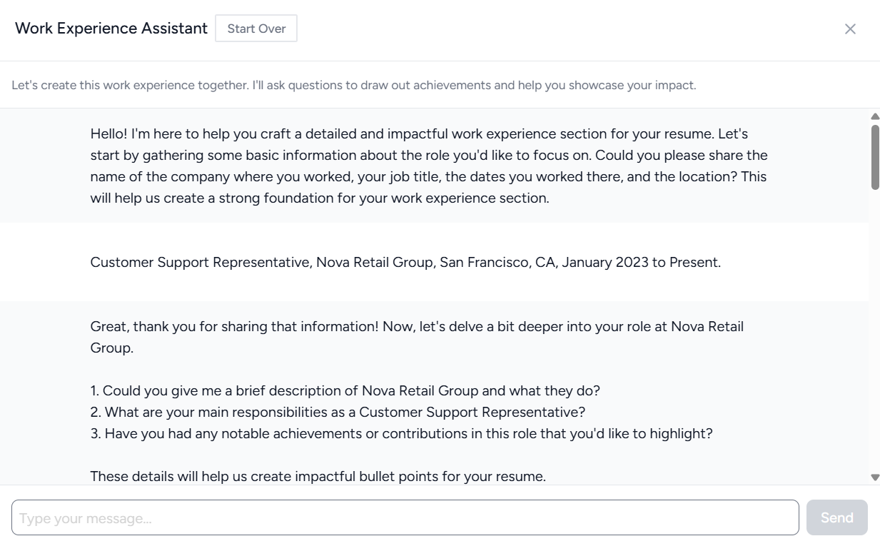 It starts with basic questions and digs into responsibilities and results to build detailed bullet points. Numbers aren’t added by default, but you can request quantifiable achievements.