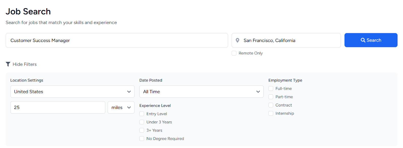 SheetsResume’s Job Search lets you filter by distance, date, experience, and job type, with resume match scoring for subscribers. However, many listings redirect to LinkedIn or Indeed, so while it’s convenient to see options in one place, you may still run into outdated or ghost jobs.