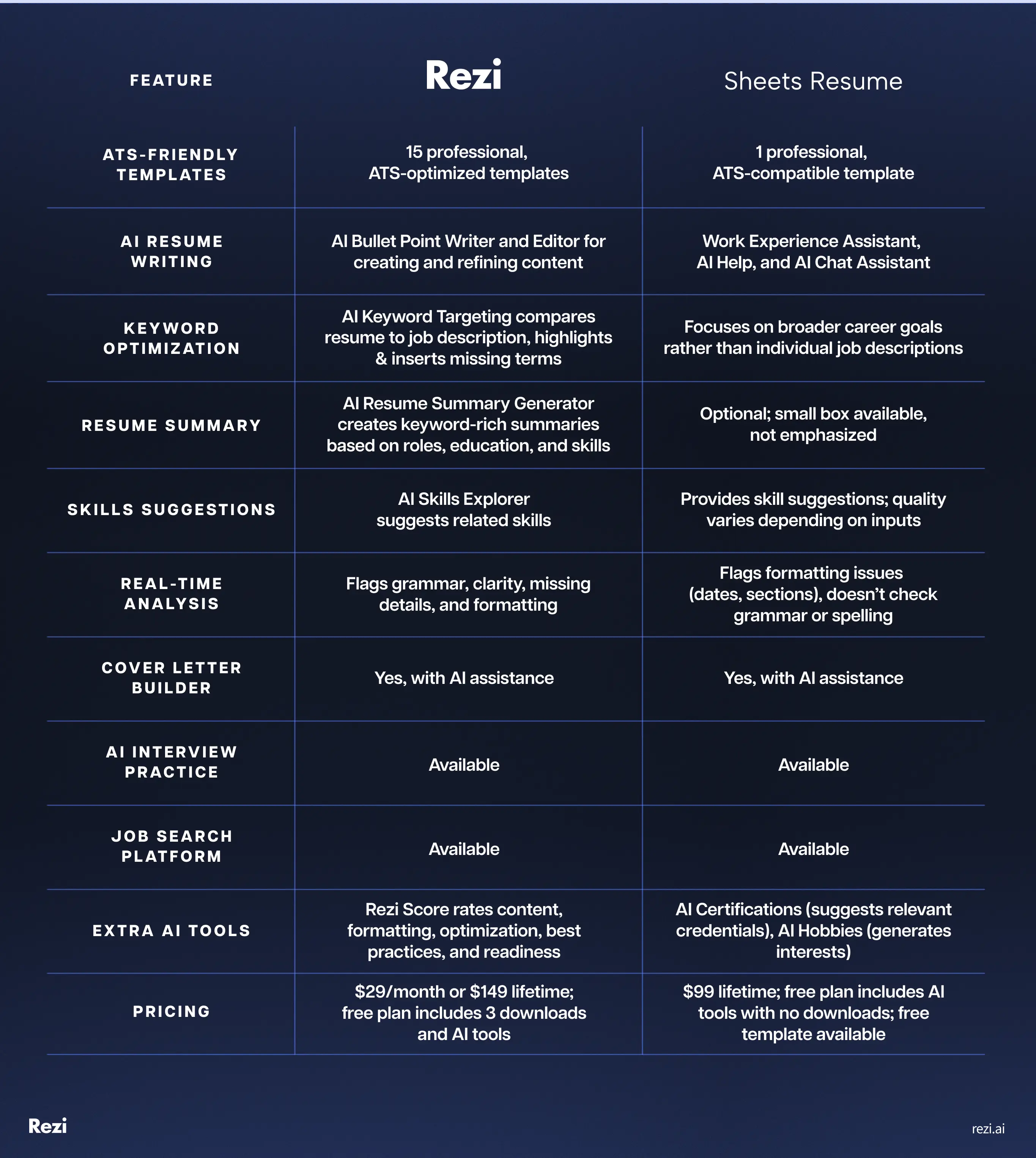 Compare Rezi and SheetsResume to find the best AI resume builder. Learn about their templates, AI writing tools, interview practice, and job search features.