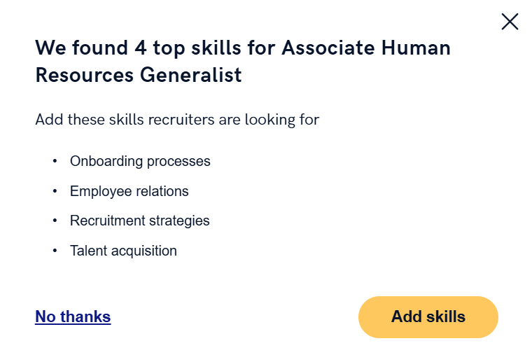 Zety’s skill tool keeps things simple — it gives you the top four skills most often linked to your job title. It’s a good starting point, though it’d be even better if it pulled skills directly from the job you’re applying for.