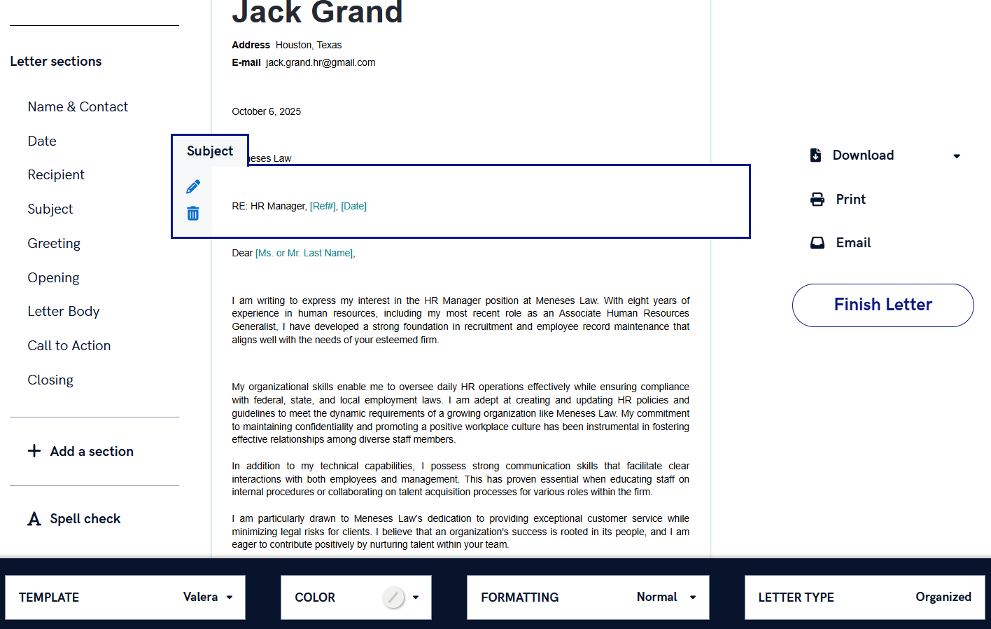 The Rezi AI Cover Letter Writer does most of the work for you. Just add the company name, a relevant past job, a recent certification or degree, and a few key skills. It creates a custom, role-specific letter you can tweak, save, and regenerate until it’s just right.
