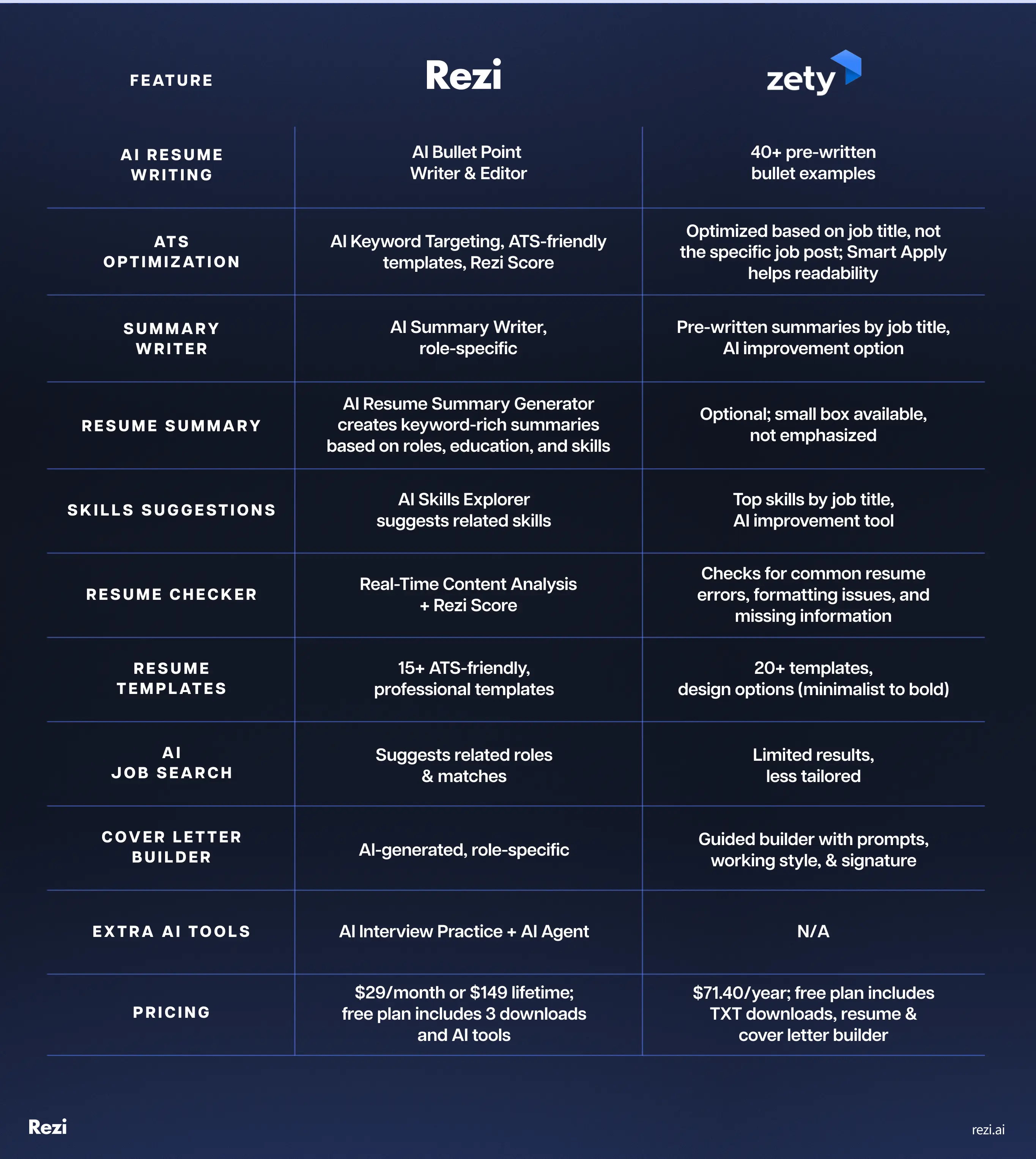 Compare Rezi and Zety’s features, templates, AI tools, and pricing to help you choose the best tool for ATS-ready, job-winning resumes.