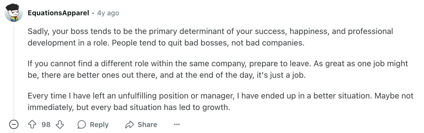 Deciding whether to stay or go isn’t black and white; it’s a personal decision with practicalities to keep in mind. Staying can feel like the “responsible” choice — it’s your comfort zone and pays the bills. Plus, leaving could mean losing any compensation you’d get if they fired you. But if your boss is clearly pushing you out through silence, criticism, or exclusion, it will inevitably take a toll. Is it worth it?