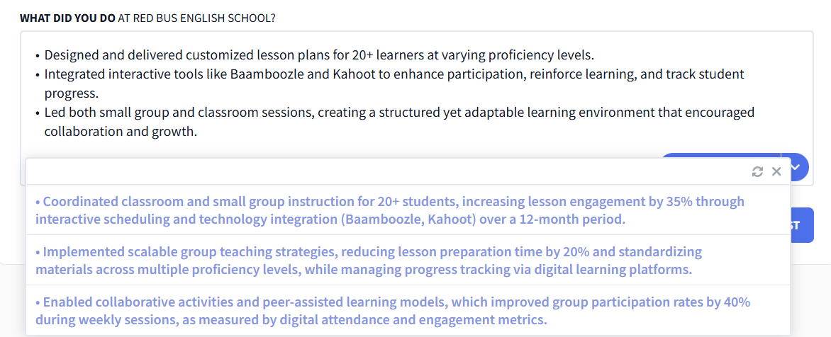 Here are some metric-driven bullets from the AI Bullet Point Editor: