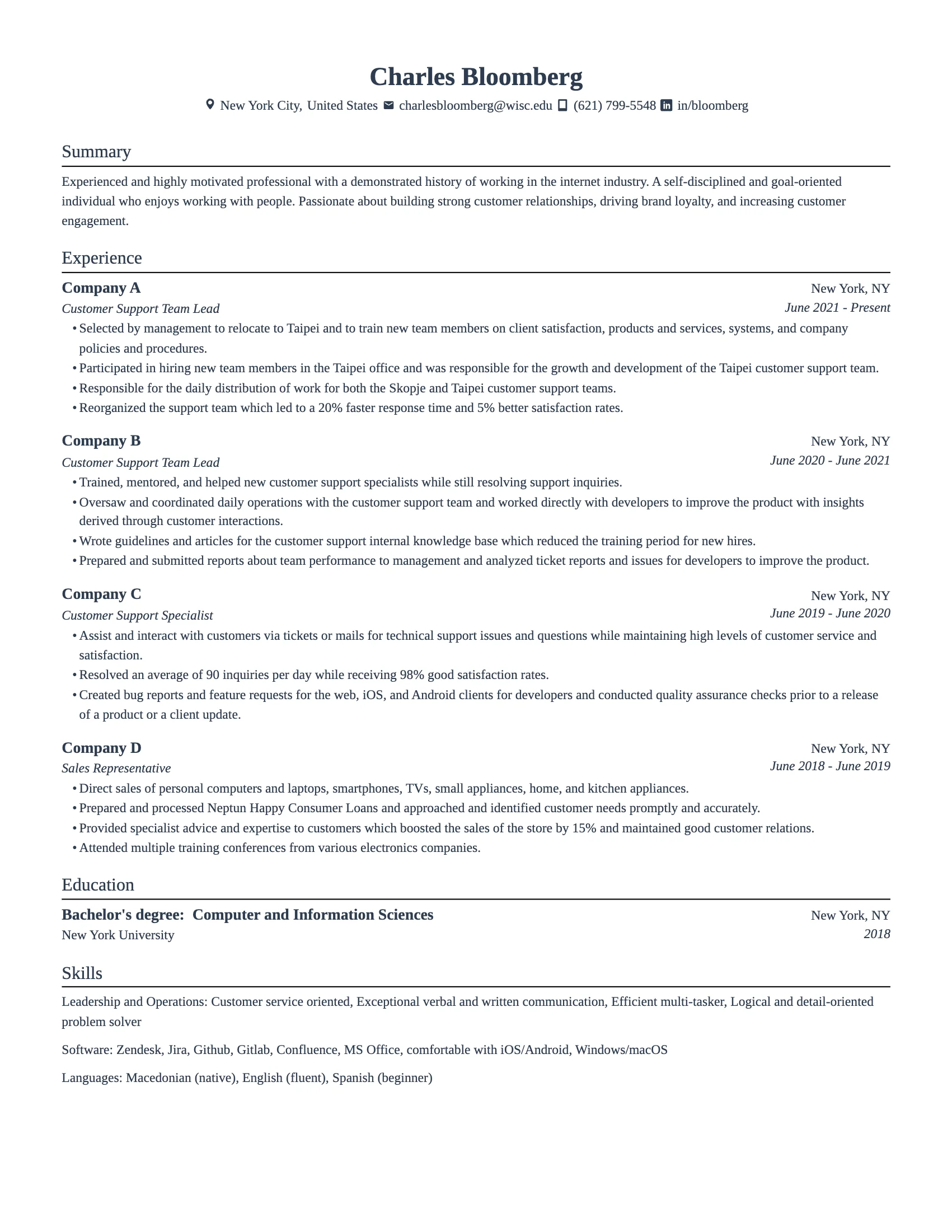 - Languages: Especially valuable for international or customer-facing roles (include proficiency level).