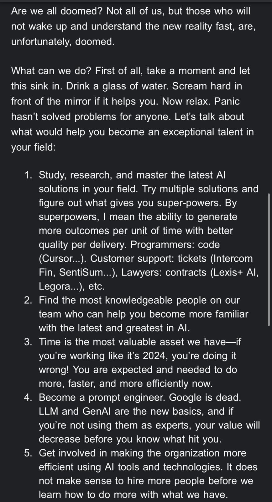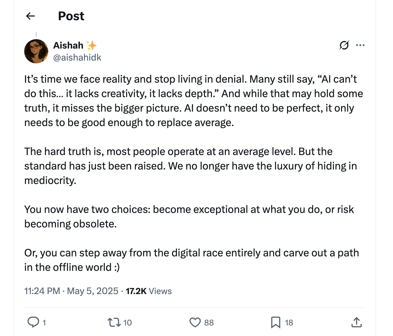 Kaufman didn’t sugarcoat his words. His post warned that the tasks we once considered “easy” will be automated, what we thought was “hard” will become the norm, and only those who really excel will remain competitive.