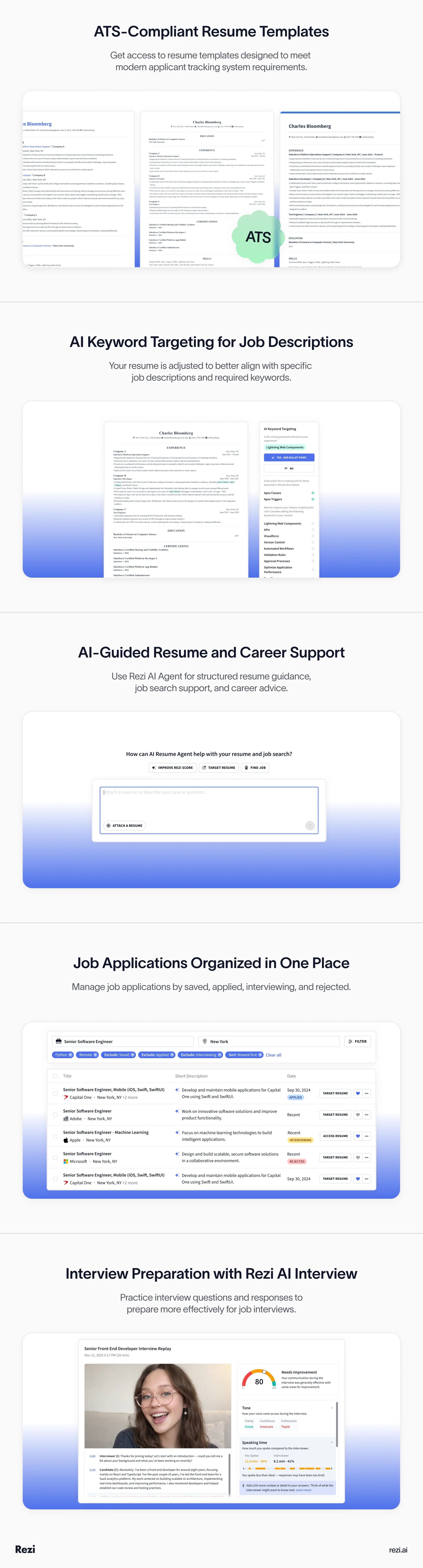 Beyond creating, improving, and tailoring a resume, Rezi provides AI tools for cover letters, interview preparation, job search management, and resignation letters. Every feature is grounded in proven resume and career best practices. This means that each and every Rezi feature follows expert-reviewed guidelines that work for both ATS systems and recruiters.