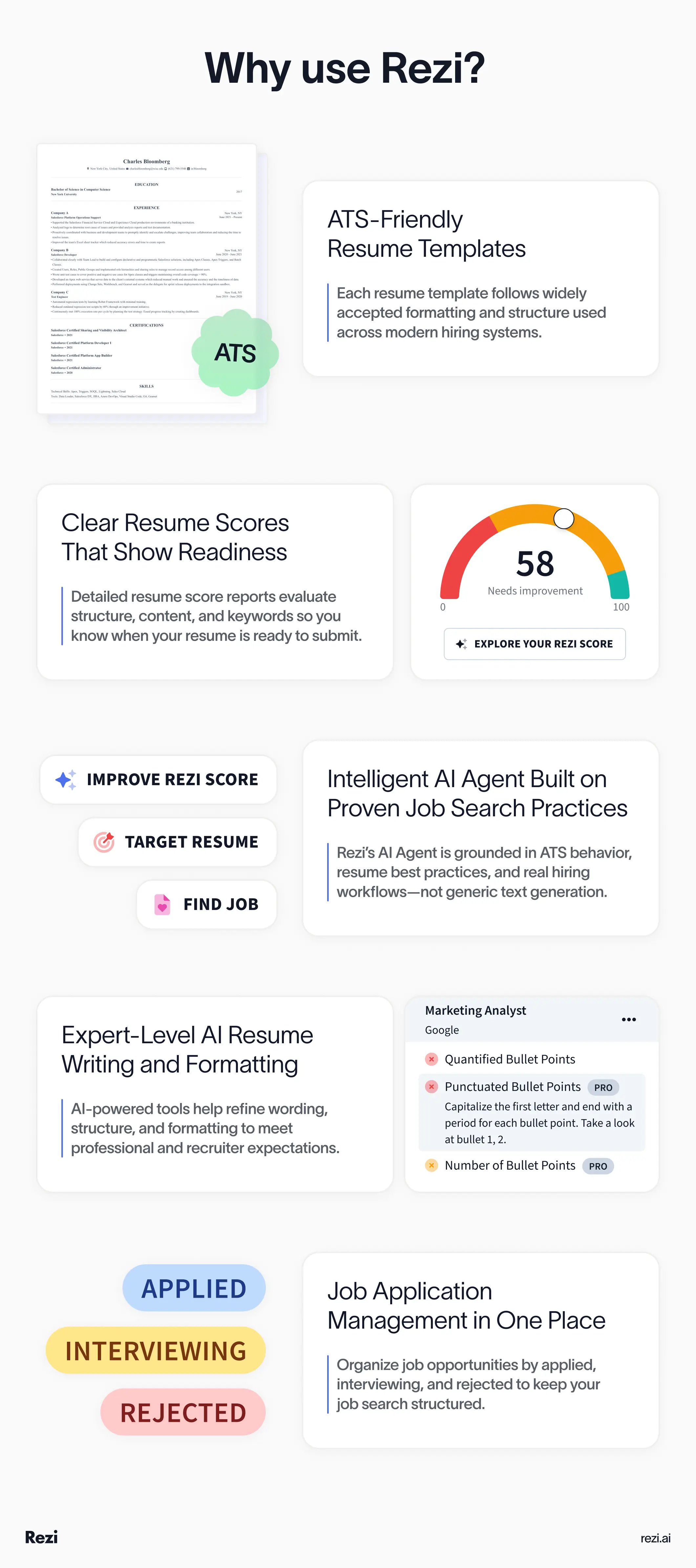 You can use Rezi to help you improve your resume. Our tools (especially our ATS resume checker) can point out what’s holding it back, including how to fix it quickly.