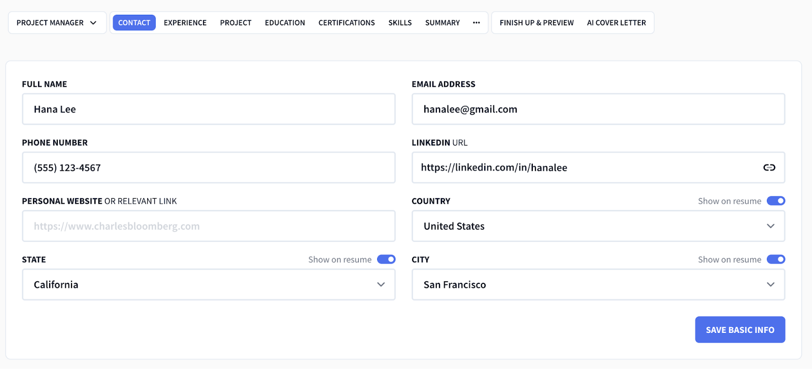 Building your resume is easy with Rezi’s guided tabs. Each tab corresponds to a section of your resume, for example: