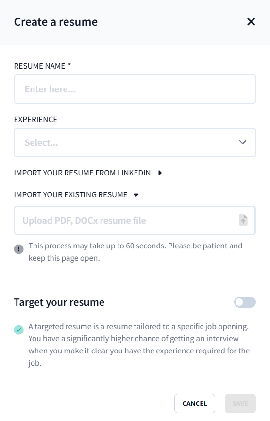 If you already have a resume, uploading it can save you time by pulling in your job titles, dates, and locations automatically.
